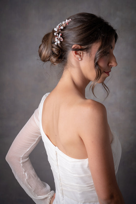 Bajo el abrazo profundo del mar, donde el mundo se sumerge en un reino de misterio, hemos encontrado nuestra fuente de inspiración. Las perlas, con su brillo nacarado, y los corales, con su belleza intrincada, son tesoros del océano capturados en cada tocado y complemento de esta colección. Los colores vibrantes de la vida submarina se entrelazan en nuestras creaciones como un reflejo del océano mismo. Cada pieza es como un fragmento de la asombrosa paleta de la vida marina, que nos invita a explorar y celebrar la belleza oculta que reside en las profundidades del mar.