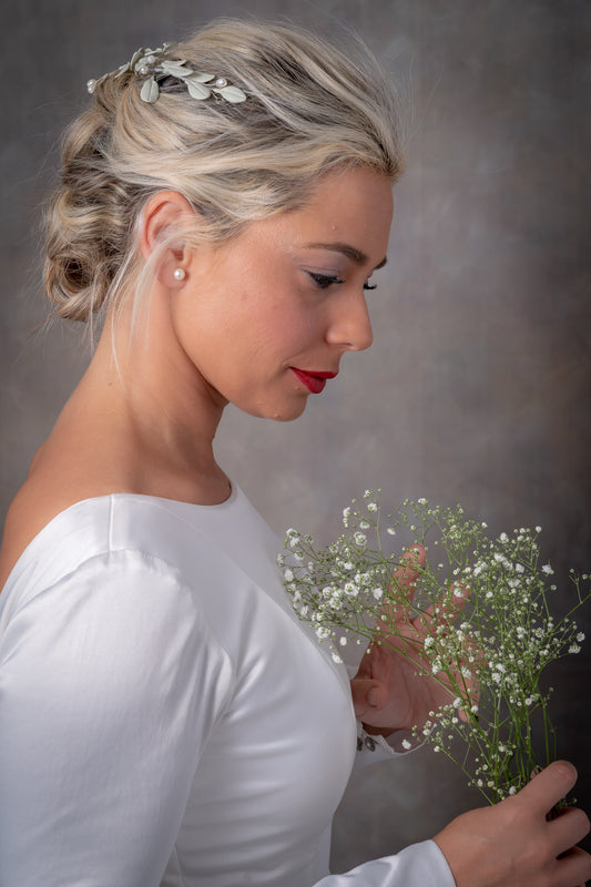 En la serenidad de los campos de olivos, donde las hojas susurran secretos al viento, encontramos nuestra musa. Las hojas del olivo, símbolo de paz y fertilidad, se entrelazan con la elegancia de las perlas. La serenidad del verde y la pureza del blanco se funden, creando una sinfonía de belleza natural. Como una celebración de la unión entre la frescura de la hoja y la delicadeza de la perla. La naturaleza se convierte en una joya, como un recordatorio de la elegancia atemporal que encontramos en los lugares más simples y auténticos.