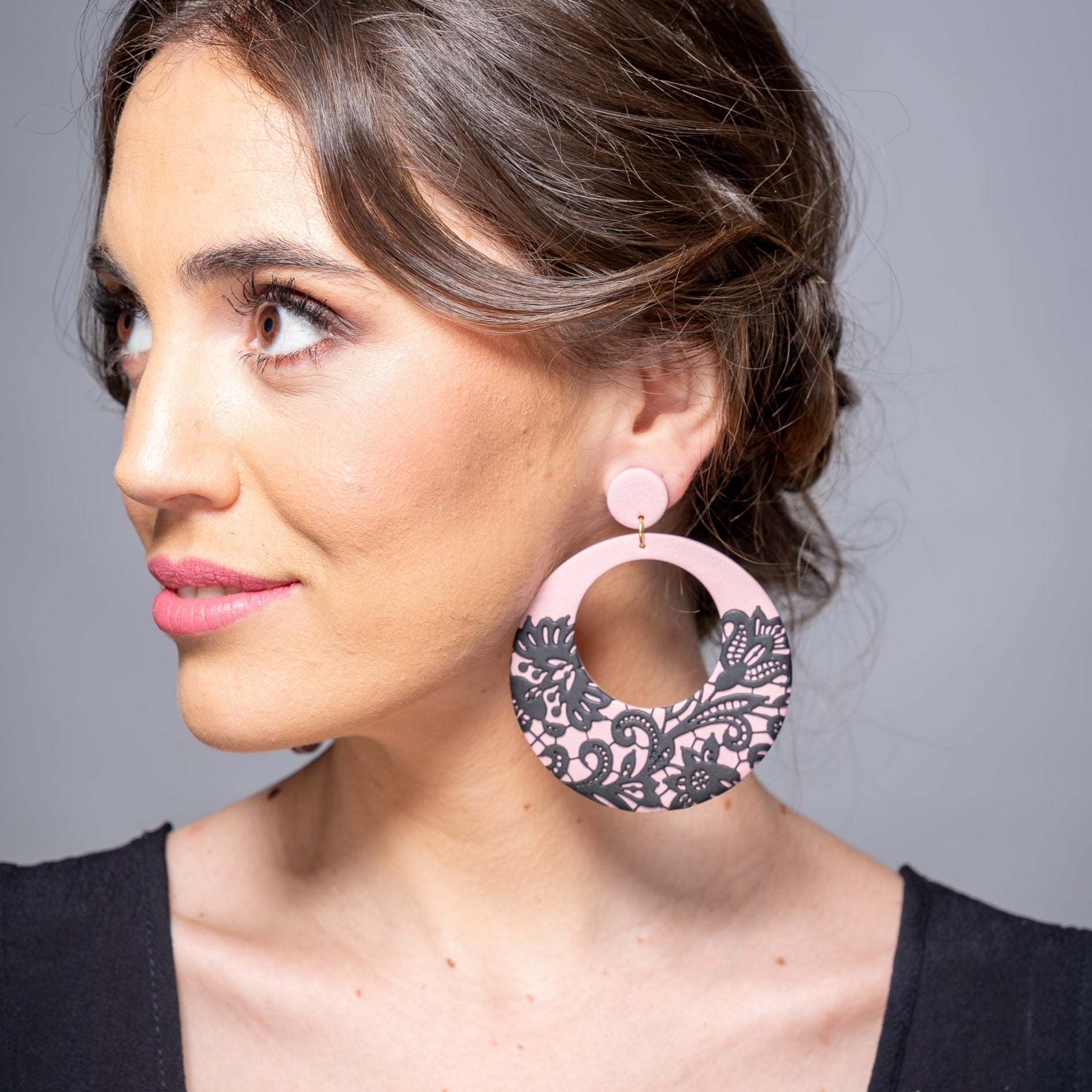 Espectaculares pendientes en forma de aro en color rosa empolvado, adornado con un aplique en negro que evoca los encajes de los trajes de flamenca que adornan los días de baile y celebración.